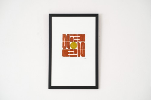 ABSTRACT PAINTING GRAFIC NO. 1. HAND-PAINTED ACRYLIC ON CANVAS. THIS ARTWORK FEATURES A GRAPHIC GEOMETRY-INSPIRED COMPOSITION MADE UP OF TERRACOTA SHAPES. A WARM MUSTARD-TONED CIRCLE INTRODUCES A FOCAL POINT THAT BALANCES THE DESIGN AND ADDS A SUBTLE CHROMATIC CONTRAST. WITH ITS MODERN MINIMALIST STYLE THE PIECE STANDS OUT FOR ITS VISUAL CLARITY AND ITS ABILITY TO BRING A CONTEMPORARY TOUCH TO ANY SPACE. IT IS FRAMED WITH GLASS AND A BLACK FRAME THAT ENHANCES THE OVERALL PRESENTATION.