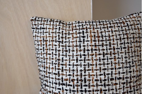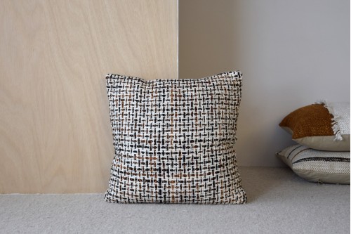 CUSHION LAZA COLLECTION N.5 COVER WITH GRID PATTERN IN MUSTARD OCHRE TONES TOUCHES OF BLACK ON AN OFF-WHITE BACKGROUND MADE IN 100% COTTON. FIBRE FILLING INCLUDED. ZIP FASTENING AT THE BACK. DRY CLEAN ONLY
