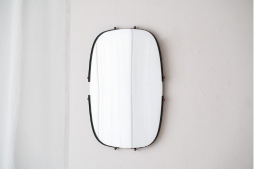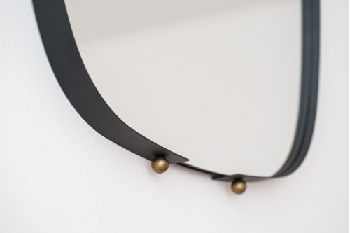 THIS WALL MIRROR COMBINES SOFT LINES AND DECORATIVE DETAILS TO ADD A DISTINCTIVE TOUCH TO ANY SPACE. ITS RECTANGULAR FORMAT FEATURES SLIGHTLY CURVED SIDES AND ROUNDED CORNERS CREATING A HARMONIOUS AND CONTEMPORARY SILHOUETTE. THE METAL FRAME FINISHED IN BLACK BREAKS ITS CONTINUITY AT THE CENTRES OF THE SIDES OF THE MIRROR LEAVING SYMMETRICAL SPACES AND ACCENTUATED BY THE USE OF ANTIQUE GOLD SPHERE DETAILS PROVIDING A COUNTERPOINT IN THE DESIGN. THE MIRROR IS PLACED AT THE BACK OF THE FRAME WHICH GIVES IT A SENSE OF DEPTH AND VISUAL ENHANCEMENT ENRICHING THE PERCEPTION OF SPACE. IDEAL FOR ENTRANCE HALLS LIVING ROOMS BEDROOMS OR SPACES LOOKING FOR A DECORATIVE PIECE WITH CHARACTER.
