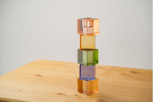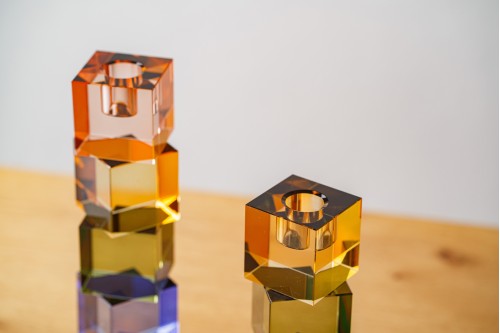 ELTA CANDLE HOLDER. PINK BLUE GREEN AMBER. SMALL SIZE. THE ELTA CANDLE HOLDER IS A TRUE SYMPHONY OF COLOR. ALONG THE SMALL CUBES THAT SHAPE IT SHADES OF PINK DEEP BLUE GREEN AND AMBER UNFOLD BLENDING WITH THE TRANSPARENCY OF THE GLASS TO CREATE A UNIQUE PIECE IN WHICH COLORS COMBINE WITHOUT OVERWHELMING.