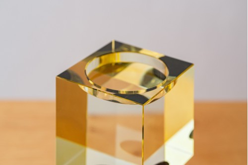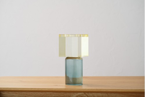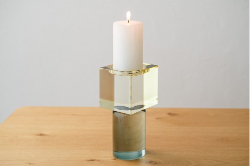 ILY CANDLE HOLDER. TURQUOISE AND SOFT LIME. BOLD VOLUMES AND VIBRANT COLORS COME TOGETHER IN THE ILY CANDLE HOLDER TO CREATE A VERY DISTINCTIVE AND PERSONAL PIECE. THE CYLINDRICAL TURQUOISE BASE IS TOPPED WITH A LARGE CUBE IN A VERY SOFT ALMOST TRANSPARENT LIME TONE THAT PROVIDES A STRIKING CONTRAST. THIS PIECE IS DESIGNED TO BRING A UNIQUE VISUAL ACCENT TO ANY SPACE.