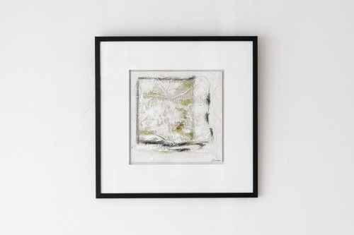 LINEN ABSTRACTION PAINTING N1. PAINTING MADE BY HAND USING A PIECE OF LINEN AS A CENTRAL MOTIF ON WHICH DIFFERENT TEXTURES ARE APPLIED AND MIXING WHITE BEIGE GRAY AND LIME GREEN TONES. FRAMED WITH OFF-WHITE PASSE-PARTOUT GLASS AND BLACK FRAME.