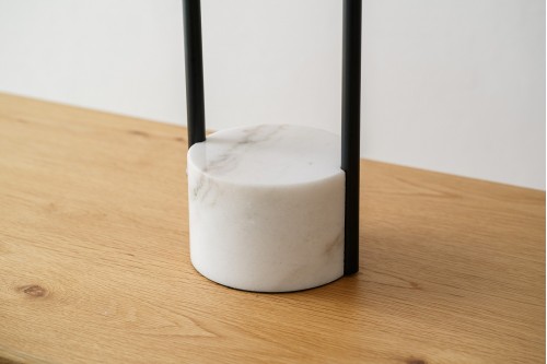 MARIÑA TABLE LAMP FEATURES A BASE MADE OF NATURAL WHITE MARBLE WITH GREY VEINING FROM WHICH TWO PARALLEL METAL PIECES IN MATTE BLACK RISE TO SUPPORT THE IVORY-TONED FABRIC SHADE. THE MARIÑA LAMP COMBINES THE GEOMETRIC LINES OF ITS DESIGN WITH THE WARMTH THAT ITS LIGHT BRINGS TO ANY CORNER.-AS THESE ARE NATURAL STONES SUBTLE VARIATIONS MAY BE PRESENT GIVING THE PIECE CHARACTER AND AUTHENTICITY.-BASE DIMENSIONS: 16.5x15x51CM -SHADE DIMENSIONS: 40x26CM-SOCKET: E27