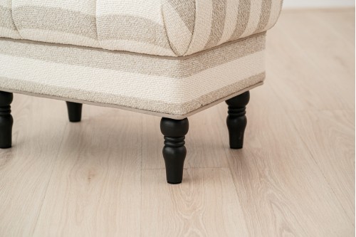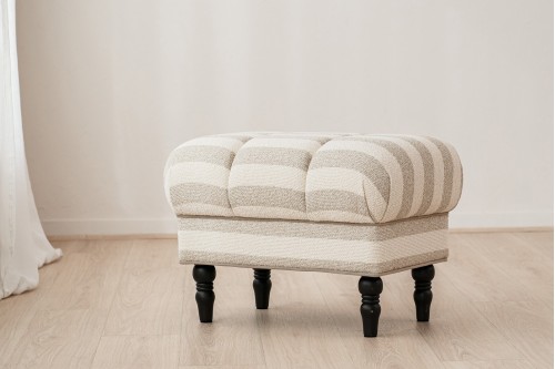 MARLO POUF. GREY AND IVORY. POUF UPHOLSTERED IN A STRIPED FABRIC COMBINING IVORY AND GREY TONES BRINGING AN ELEGANT AND CONTEMPORARY STYLE. THE SEAT FEATURES A PADDED DESIGN WITH CURVED SECTIONS THAT ENHANCE VOLUME AND COMFORT. A GREY VELVET PIPING OUTLINES AND DEFINES THE CONTOUR. THE POUF STANDS ON SOLID WOOD LEGS WITH A CLASSIC-INSPIRED SHAPE UPDATED WITH A MATTE BLACK FINISH.