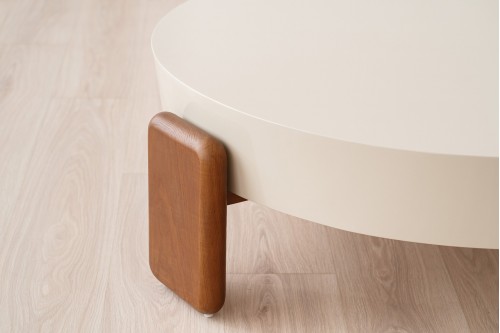 ROUND COFFEE TABLE WITH A ONE-METRE DIAMETER CONICAL-SHAPED CENTREPIECE FINISHED IN HIGH-GLOSS BEIGE. THIS PIECE IS SUPPORTED BY THREE PIECES WITH ROUNDED EDGES IN SOLID WOOD AND FINISHED IN WALNUT. IT IS A PIECE WITH VOLUME AND DEFINED LINES THAT SEEMS TO FLOAT WHEN ELEVATED OFF THE FLOOR THANKS TO THE THREE BASE ELEMENTS ON WHICH IT RESTS IN A VOLUME LACQUERED IN GLOSS BEIGE. THE TONES AND GRAIN OF THE WOOD MAY VARY FROM ONE PIECE TO ANOTHER.