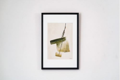 OLIVE STROKE PAINTING NO. 1. HAND-PAINTED ABSTRACT ARTWORK ON CANVAS. SET AGAINST A SANDY BACKGROUND THE COMPOSITION HIGHLIGHTS OLIVE-GREEN TONES IN VARIOUS INTENSITIES AND GRADIENTS. THE RESULT IS A BALANCED PIECE WITH SIMPLE CLEAN LINES THAT ADDS A SUBTLE YET REFINED TOUCH OF COLOR TO ANY SPACE. FRAMED WITH GLASS AND A SLEEK BLACK FRAME.