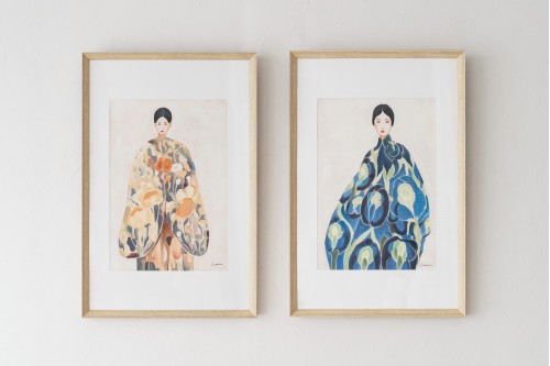 PAINTING WOMAN FROM EAST N3. HANDMADE PAINTING ON CANVAS. THE CENTRAL MOTIF IS A WOMAN WITH ORIENTAL-INSPIRED DRESS IN BLUE AND GREEN COLORS ON A BEIGE BACKGROUND WITH LIGHT TEXTURE. FRAMED IN GLASS AND FRAMED IN NATURAL WOOD COLOR.