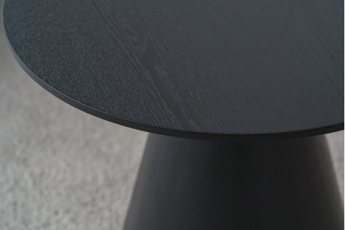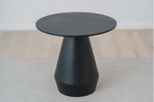 ROUND SIDE TABLE MADE OF MDF BOARD VENEERED IN NATURAL ASH WOOD STAINED IN BLACK COLOR. IT IS A TABLE WITH A CASUAL DESIGN WITH A SET OF CONICAL SHAPES ON THE BASE AND A STRAIGHT-EDGED TABLETOP. PERFECT TO COMBINE IN A NATURAL ENVIRONMENT AS WELL AS IN A MORE SOPHISTICATED SPACE THANKS TO ITS CAREFUL DESIGN AND THE PROPORTION OF ITS SHAPES.
