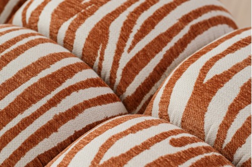 SITA POUF. TERRACOTTA AND IVORY. WITH ROUNDED BOLD LINES THE SITA POUF IS A DESIGN CREATED TO STAND OUT. THE SEAT PADDED WITH CURVED SECTIONS IS UPHOLSTERED IN A STRIKING PATTERN IN TERRACOTTA AND IVORY TONES THAT ENHANCES THE PIECE’S VOLUMES. THE RESULT IS A POUF WITH PERSONALITY AND STYLE BRINGING VISUAL INTEREST TO THE SPACE ALL ON ITS OWN.
