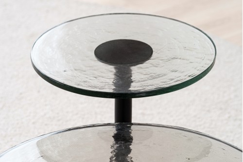 MODERN SIDE TABLE WITH A MINIMALIST DESIGN WITH A CENTRAL TULIP STYLE BASE IN ANTIQUE BLACK METAL AND A BEAUTIFUL CIRCULAR GLASS TOP 2 CM THICK AND TEXTURED THANKS TO CIRCULAR GROOVES. IT MATCHES WITH A SIMILAR TABLE OF GREATER HEIGHT CREATING A SET OF SIDE TABLES PERFECT IN ANY CORNER AND TOTALLY COMBINABLE WITH DIFFERENT STYLES OF DECORATION.