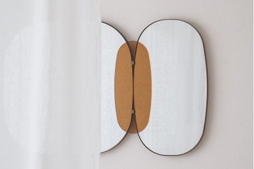 WALL MIRROR THAT COMBINES SMOOTH GEOMETRY AND FINE MATERIALS IN A VISUALLY HARMONIOUS COMPOSITION. FORMED BY TWO SQUARE-SHAPED MIRRORS WITH ROUNDED CORNERS AND A VERTICAL CENTRE PIECE OF TEXTURED AMBER-COLOURED GLASS WITH CURVED EDGES THIS PIECE BALANCES CONTRAST AND WARMTH. THE ANTIQUED GOLD METAL FRAME ADDS A TOUCH OF TIMELESS ELEGANCE. IS A VERSATILE CHOICE FOR BOTH RESIDENTIAL AND COMMERCIAL SPACES FROM LIVING AND DINING ROOMS TO RECEPTION AREAS OR DESIGNER WINDOW DISPLAYS.