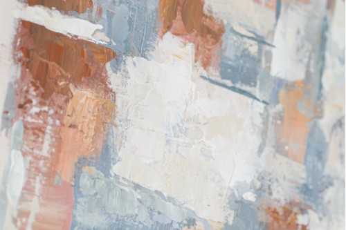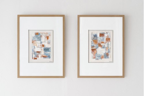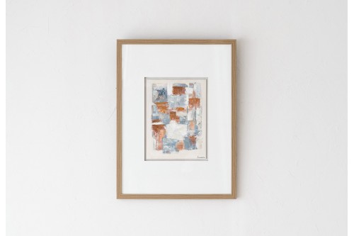 CUADRO ABSTRACTO AGUA Y TIERRA N2. PINTURA REALIZADA A MANO SOBRE LIENZO. MEZCLA TONOS AZULES MARRONES Y BEIGE QUE SE APLICAN CON PINCELADAS DE TEXTURA GRUESA REPRESENTANDO LOS ELEMENTOS DEL AGUA Y LA TIERRA. ENMARCADO CON PASPARTÚ EN TONO BLANCO ROTO VIDRIO Y MARCO EN TONO ROBLE.