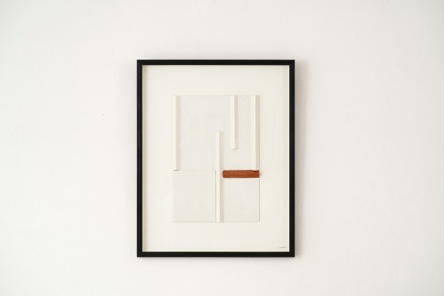 CUADRO FORMAS TERRACOTA. COMPOSICIÓN ABSTRACTA DE INSPIRACIÓN GEOMÉTRICA REALIZADA EN DM SOBRE LA QUE SE HA APLICADO UNA PINTURA CON TEXTURA ARENA EN UN TONO BLANCO CÁLIDO. EL CONTRASTE A LA CALMA DE LA COMPOSICIÓN SE INTRODUCE CON UN TRAZO EN COLOR TERRACOTA QUE SE APLICA SOBRE UNO DE LOS RELIEVES. LA COMPOSICIÓN SE HA ENMARCADO UTILIZANDO CRISTAL Y UN MARCO EN COLOR NEGRO. . IDEAL PARA AÑADIR UN TOQUE CONTEMPORÁNEO A CUALQUIER ESPACIO.