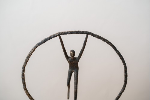 ESCULTURA SOSTENIENDO EL CÍRCULO. REALIZADA EN METAL Y MÁRMOL. REPRESENTA UNA FIGURA HUMANA CON LOS BRAZOS EXTENDIDOS EN UN ESFUERZO POR SOSTENER UN ENORME CÍRCULO QUE LA RODEA. LA BASE ESTÁ FORMADA POR UN CUBO DE MÁRMOL BLANCO CON VETAS EN GRIS QUE REALZA LA ESCULTURA.-AL TRATARSE DE PIEDRAS NATURALES Y ACABADOS ARTESANALES REALIZADOS A MANO PUEDE HABER VARIACIONES DE UNAS PIEZAS A OTRAS ASÍ COMO POROSIDADES EN EL MÁRMOL Y VETAS DE DISTINTAS TONALIDADES. ESTOS ASPECTOS REALZAN EL CARÁCTER NATURAL DE LAS PIEZAS Y LAS HACEN ÚNICAS.-MEDIDAS DE LA BASE: 10x10x10CM