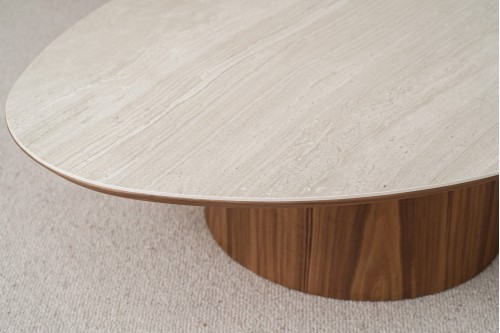 MESA DE CENTRO DE FORMA ORGÁNICA CON SOBRE REALIZADO EN MATERIAL CERÁMICO DE 6MM DE ESPESOR EN TONOS GRIS- BLANCO CON UNA TEXTURA LEVEMENTE RUGOSA QUE RECUERZA EL ACABADO PÉTREO NATURAL COLOCADO SOBRE UNA BASE DE DM ACABADA EN CHAPA DE NOGAL. LA PATA CENTRAL TIENE FORMA CILÍNDRICA SOBRE LA QUE SE APOYA EL TABLERO IMPRIMIENDO PRESENCIA AL DISEÑO.Y HACIENDO DESTACAR LA FORMA IRREGULAR DE LA PARTE SUPERIOR. PROPONEMOS LA COMBINACIÓN CON OTRA MESA EN CHAPA DE NOGAL CREANDO UN CONJUNTO EN TOTAL ARMONIA DE TONOS Y MATERIALES. LOS TONOS Y DIBUJOS USADOS EN LOS MATERIALES PUEDEN VARIAR DE UNA PIEZA A OTRA.CERÁMICO N14
