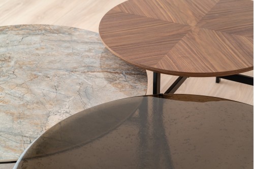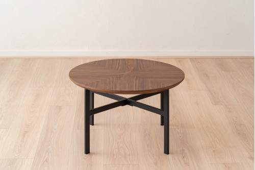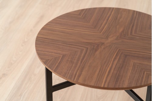MESA DE CENTRO REDONDA REALIZADA EN TABLERO DE DM RECHAPADO EN NOGAL Y ESTRUCTURA EN METAL NEGRO MATE. SU TABLERO EN NOGAL DISPUESTO EN PATRÓN RADIAL APORTA UNA ESTÉTICA CUIDADA Y ACTUAL IDEAL EN DISTINTOS AMBIENTES. LAS PATAS EN METAL ACABADO NEGRO MATE GARANTIZAN UN DISEÑO ESTILIZADO QUE SE ADAPTA A CUALQUIER DECORACIÓN. ESTE MODELO FORMA PARTE DE UN CONJUNTO DE TRES MESAS A DISTINTAS ALTURAS QUE MEZCLAN EL NOGAL CON VIDRIO TEXTURIZADO EN AMBAR Y CERÁMICO.