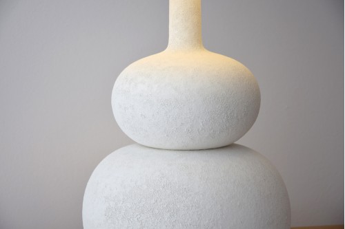 LAMPE DE TABLE EN CÉRAMIQUE AVEC FINITION MATTE NATURELLE ET TEXTURE RUGUEUSE COMME LA PIERRE. ABAT-JOUR CYLINDRIQUE EN COTON NATUREL DE COULEUR BLANCHE AVEC BORDURE NOIRE.-DIMENSIONS DE LA BASE : 29XH43CM-DIMENSIONS DE L-ABAT-JOUR : 30XH35CM