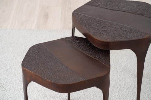 SET DE DEUX TABLES D-APPOINT EN MÉTAL AVEC FINITION EFFET ROUILLE. CES TABLES COMBINENT UN DESIGN ORGANIQUE CONTEMPORAIN AVEC UNE TEXTURE UNIQUE QUI SE DISTINGUERA DANS N-IMPORTE QUEL ENVIRONNEMENT. AVEC LEUR FORME IRRÉGULIÈRE LEURS LIGNES DOUCES ET LEUR STYLE SCULPTURAL CES TABLES SONT IDÉALES POUR LES ESPACES QUI RECHERCHENT UN ÉQUILIBRE ENTRE L-ARTISTIQUE ET LE FONCTIONNEL. IDÉALES POUR FORMER UN ENSEMBLE OU POUR ÊTRE UTILISÉES INDIVIDUELLEMENT ELLES APPORTENT DE LA CHALEUR ET UNE TOUCHE ARTISANALE AU SALON À LA CHAMBRE À COUCHER OU AU COIN LECTURE. LA COULEUR ET LA TEXTURE PEUVENT VARIER D-UNE PIÈCE À L-AUTRE.