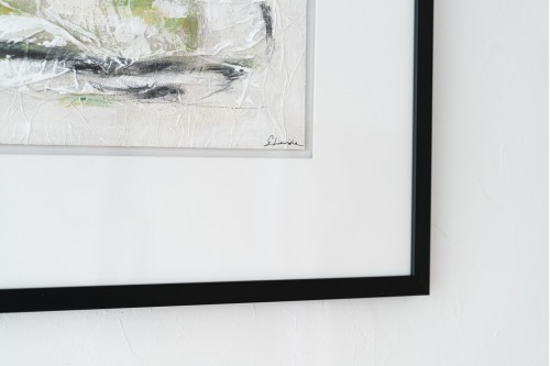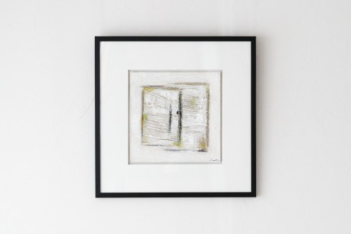 PEINTURE ABSTRAITE SUR LIN N2. TABLEAU RÉALISÉ À LA MAIN À PARTIR D-UN MORCEAU DE LIN COMME MOTIF CENTRAL SUR LEQUEL SONT APPLIQUÉES DIFFÉRENTES TEXTURES ET MÊLANT DES TONS BLANCS BEIGES GRIS ET VERT LIME. ENCADRÉ AVEC UN PASSE-PARTOUT BLANC CASSÉ VERRE ET CADRE EN NOIR.