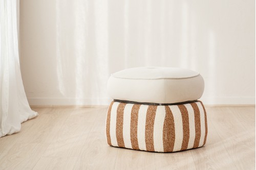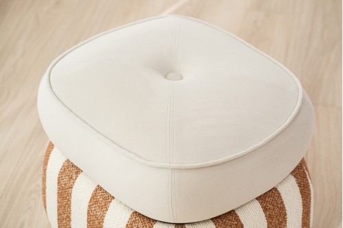 SET DE 2 POUFS DUNA. PIERRE ET TERRE CUITE. APPORTEZ UNE TOUCHE D’ÉLÉGANCE À VOTRE INTÉRIEUR AVEC CE SET DE 2 POUFS DUNA AU DESIGN CARRÉ ET À L’ALLURE MODERNE. LA PARTIE SUPÉRIEURE EN TISSU VELOUTÉ COULEUR PIERRE CLAIRE S’HARMONISE PARFAITEMENT AVEC LA BASE TAPISSÉE D’UN MOTIF RAYÉ DANS LES TONS TERRE CUITE ET BEIGE. UN ANNEAU MÉTALLIQUE NOIR MAT AU CENTRE VIENT SUBLIMER L’ENSEMBLE AVEC UNE NOTE CONTEMPORAINE. IDÉAL COMME ASSISE SUPPLÉMENTAIRE ÉLÉMENT DÉCORATIF OU DÉTAIL CHIC DANS N’IMPORTE QUELLE PIÈCE.