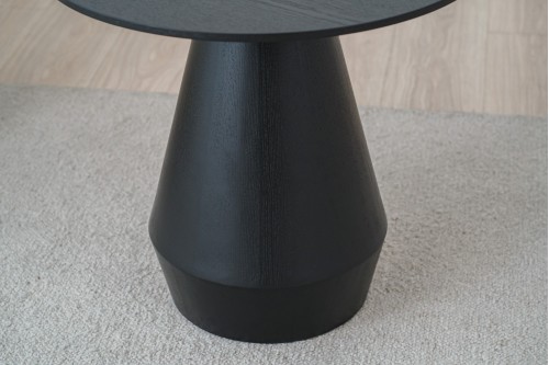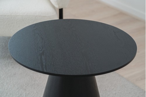 TABLE D-APPOINT RONDE EN PANNEAU DM PLAQUÉ FRÊNE NATUREL TEINTÉ EN NOIR. IL S-AGIT D-UNE TABLE AU DESIGN DÉCONTRACTÉ AVEC UN ENSEMBLE DE FORMES CONIQUES À LA BASE ET UN PLATEAU AUX BORDS DROITS. PARFAITE POUR S-INTÉGRER DANS UN ENVIRONNEMENT NATUREL COMME DANS UN ESPACE PLUS SOPHISTIQUÉ GRÂCE À SON DESIGN SOIGNÉ ET À LA PROPORTION DE SES FORMES.