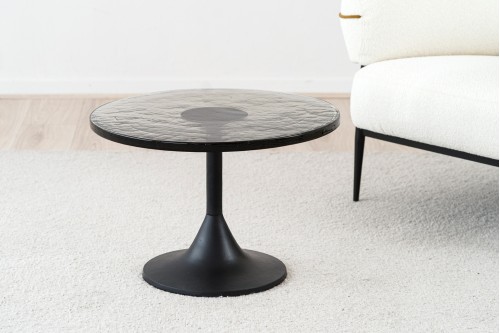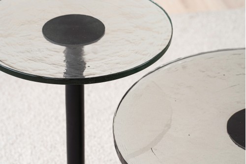 TABLE D-APPOINT MODERNE AU DESIGN MINIMALISTE AVEC UNE BASE CENTRALE DE STYLE TULIPE EN FINITION MÉTAL NOIR ANTIQUE ET UN BEAU PLATEAU CIRCULAIRE EN VERRE DE 2 CM D-ÉPAISSEUR ET TEXTURÉ GRÂCE À DES RAINURES CIRCULAIRES. ELLE S-ASSOCIE À UNE TABLE SIMILAIRE DE PLUS GRANDE HAUTEUR CRÉANT AINSI UN ENSEMBLE DE TABLES D-APPOINT PARFAIT DANS N-IMPORTE QUEL COIN ET PARFAITEMENT COMBINABLE AVEC DIFFÉRENTS STYLES DE DÉCORATION.